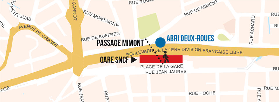 L’abri vélo est situé à proximité de l’arrêt « Saint Cassien », desservi par la ligne Palm Express A (et Palm Night N20) et la ligne 17, ainsi que de l’arrêt « Palais des Victoires » desservi par la ligne 1 (et Palm Night N1). Deux abris sont disponibles sur le site.