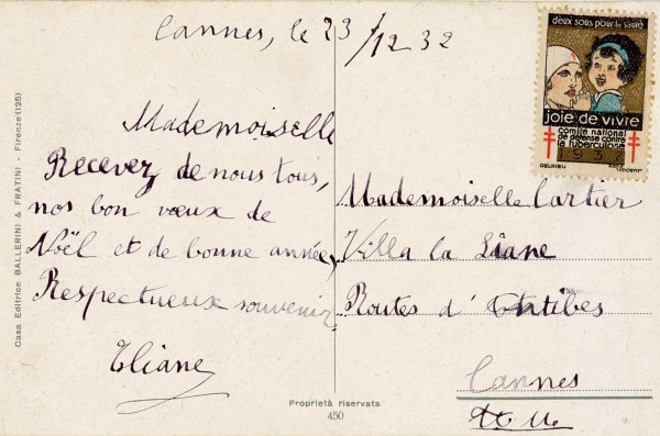 Carte de vœux adressée à Miss Cartier, de la part d’une Cannoise prénommée Eliane, 1932