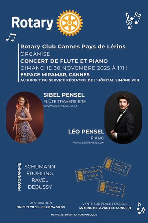 Concert exceptionnel de flûte traversière et piano, organisé par le Rotary Club Cannes Pays de Lérins, donné par Sibel Pensel et Léo Pensel.