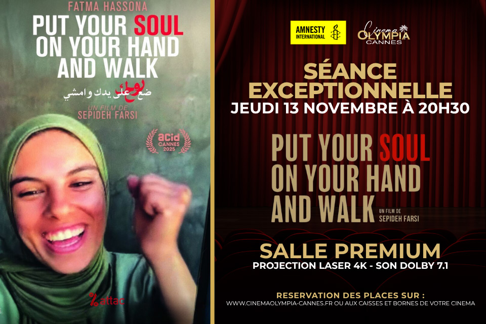 Séance exceptionnelle avec la projection du film Put your soul on your hand and walk de Sepideh Farsi, présenté à l’ACID Cannes 2025, en partenariat avec Amnesty International et Attac.