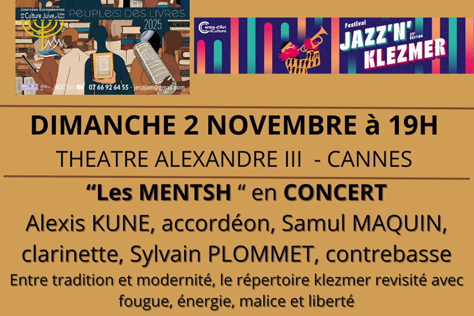 Le temps d'une soirée, les Mentsh (Alexis Kune à l'accordéon, Samul Maquin à la clarinette et Sylvain Plommet à la contrebasse) revisiteront le répertoire klezmer avec fougue, énergie, malice et liberté.