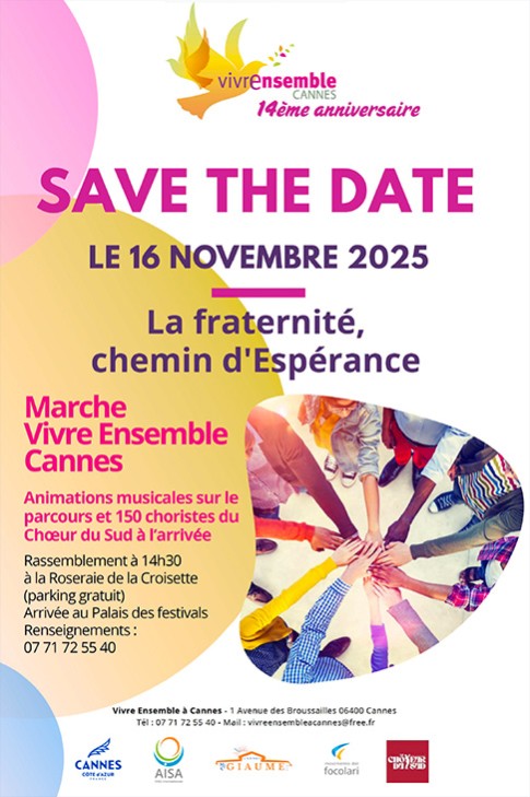 Cette marche rassemble des personnes de toutes origines et confessions, croyants ou non-croyants pour manifester leur engagement à la fraternité et à la paix. De nombreuses chorales animeront le parcours qui se conclura sur les marches du palais des festivals avec 150 choristes du chœur du Sud.