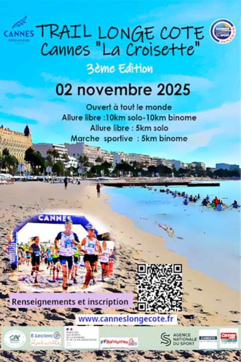 Troisième édition du Trail Longe Côte Cannes "La Croisette", organisée par l'ASLM Cannes Longe Côte, qui réunit les amateurs de marche aquatique sportive et s'inscrit cette année au calendrier du premier championnat de France. Ouvert aux licenciés ou non-licenciés, pour tous les formats : 10 km, 5 km et 2 km.