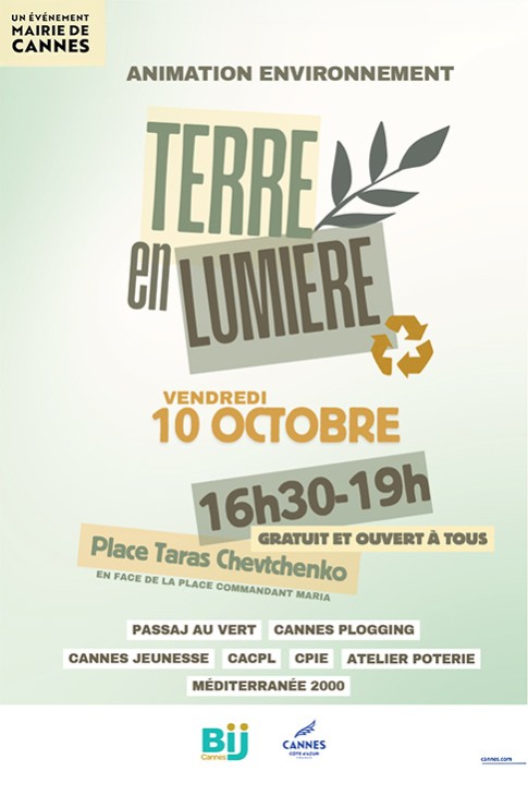 Organisée par le Bureau Information Jeunesse, cette animation invite le public à découvrir et à mieux comprendre les enjeux écologiques au travers des diverses activités proposées. Plusieurs associations seront présentes pour sensibiliser sur l'écologie (PASSAJ au vert, Cannes Plogging, Cannes Jeunesse, CAPL, CPIE, Atelier Poterie, Méditerranée 2000).