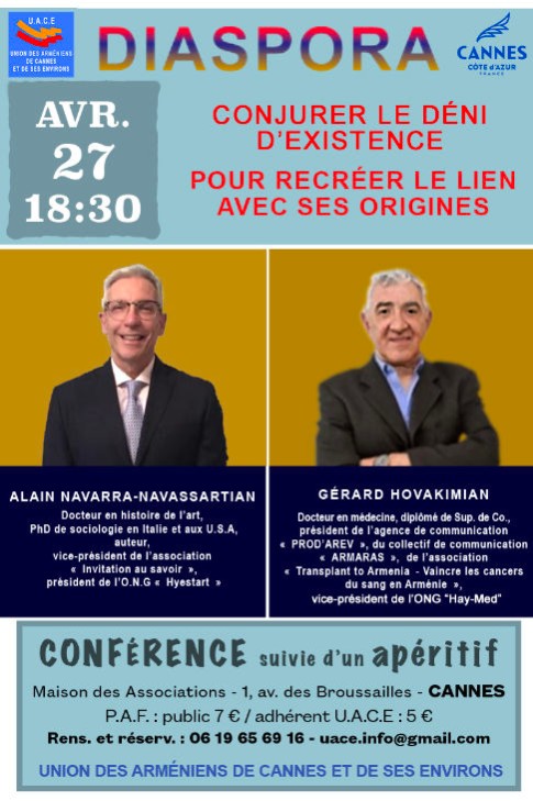 Une conférence sur le thème de la transmission transgénérationnelle d'un traumatisme, animée par Alain NAVARRA-NAVASSARTIAN, docteur en histoire de l'art, PhD de sociologie en Italie et aux U.S.A., auteur, vice-président de l'association "Invitation au savoir", et Gérard HOVAKIMIAN, docteur en médecine, diplômé d’une École supérieure de commerce.