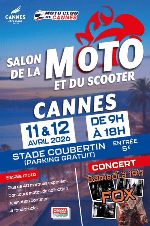 Troisième édition du salon de la moto et du scooter de Cannes qui permet aux visiteurs de rencontrer les concessionnaires moto et scooter du bassin cannois et du département, dont de l'électrique, des essais, des équipementiers, des services, des institutionnels du monde du deux-roues, ainsi qu'un programme continu d’animation : concerts pop-rock la journée, un concert rock le samedi soir, un concours de motos de collection, interviews de pilotes, pôle Prévention avec la Police nationale et la Préfecture, 4 food-trucks pour se restaurer et un « village enfants » pour les familles.