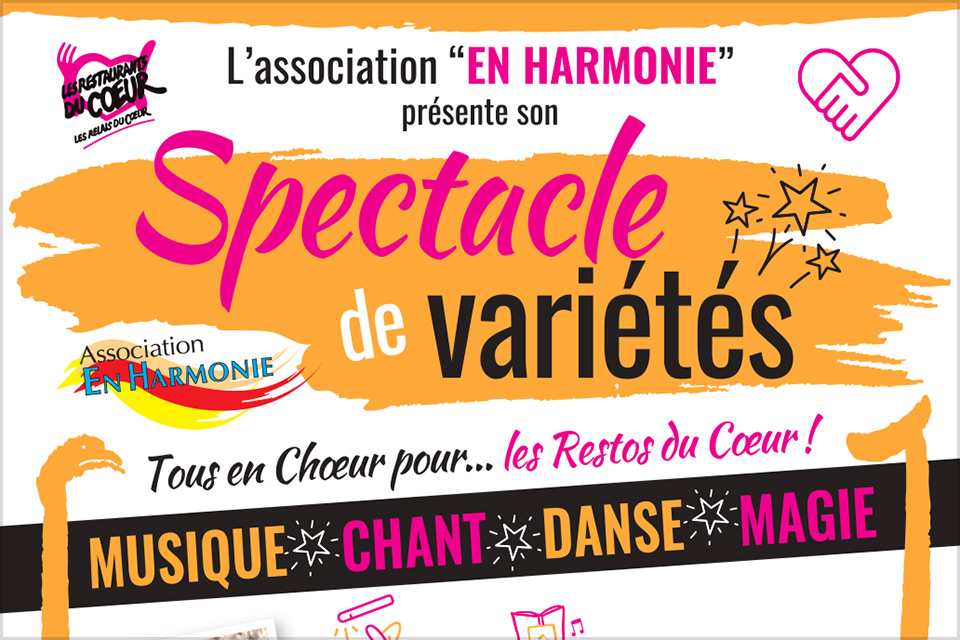 Spectacle de variétés présenté par l'association En Harmonie, en faveur des Restos du Cœur, avec le soutien de la Mairie de Cannes et de Cannes Seniors Le club, avec au programme de la musique, du chant, de la danse et de la magie. Le spectacle est présenté par le magicien Tanguy avec la participation de la chorale Azur et Joie, les belles voix des chanteurs de l'association En Harmonie, les talents Hugo et Romane de The Voice Kids, la Diamond Company et les championnes d'Europe de danse claquette de EMT Dance Studio.