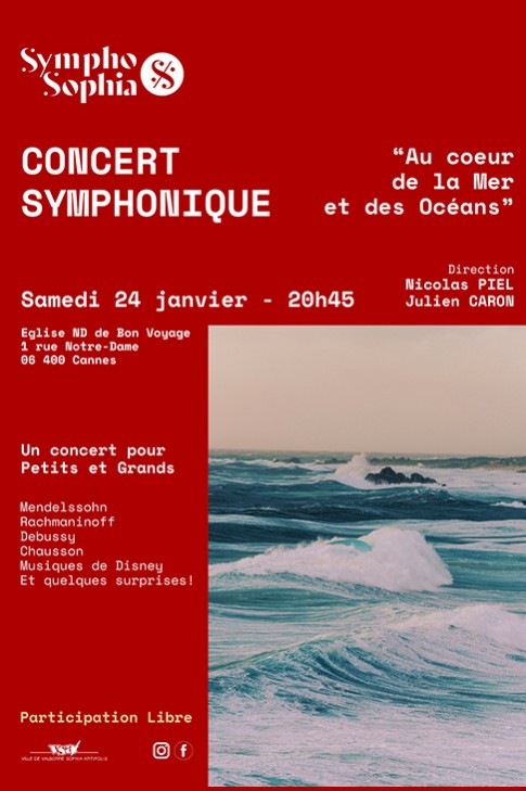 Concert sur le thème "Au cœur de la mer et des océans", par l'orchestre Sympho Sophia, sous la direction de Nicolas Piel et Julien Caron. Un concert symphonique pour petits et grands : Mendelssohn, Rachmaninoff, Debussy, musiques de Disney et quelques surprises !