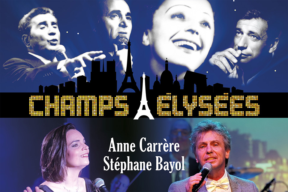 Spectacle musical dédié à la chanson française avec la chanteuse Anne CARRERE et le chanteur Stéphane BAYOL, accompagné par l'orchestre "Champs-Élysées Chansons Françaises " et ses 10 musiciens.
