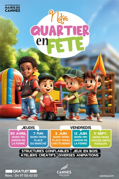 Manifestation gratuite, organisée par la Mairie de Cannes, durant laquelle il est proposé aux habitants des différents quartiers de profiter, le temps d’un après-midi, de différentes animations : ateliers créatifs, structures gonflables, jeux en bois et plein d’autres surprises.
