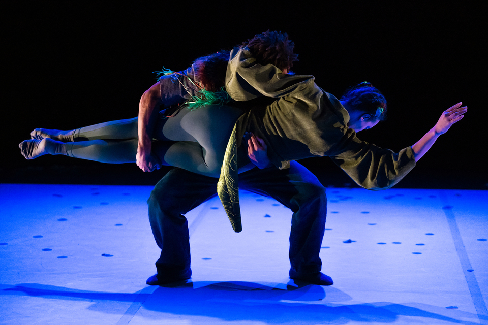 She, all finesse and elevation; he, grounded through the pelvis, with gestures at first clumsy, then increasingly fluid—the lightness of one balancing the power of the other. As their physicalities gradually become complementary, the voice of an African storyteller gives way to the song of a griot, then to a musical composition that shifts toward progressive rock. In this successful kaleidoscope of contrasting influences, one recognizes the signature of Amala Dianor, ever curious to blend styles and vocabularies.