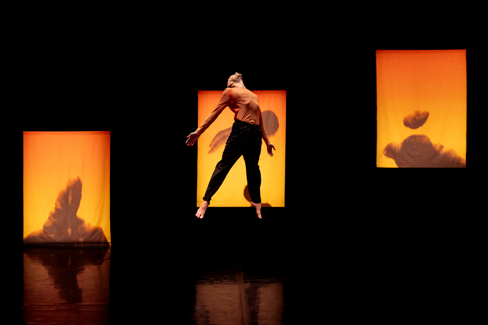 Alone on stage, he first traces the arc of a life in a loop, from birth to reincarnation, testing gesture after gesture against gravity, searching for balance — or rather, the “maintained imbalance” that both limits and prevents a fall. Eventually, everything tips into a world ruled by imagination, where instinct guides desire. Variéras’ soundscape, blending music, diverse noises, and children’s voices, accompanies the journey, while Alice Vasseur’s abstract, sensitive scenography — including three large colorful canvases on stage — frames each step. Playful yet disorienting, the gradual relearning of simple actions (“You walk and you fall!”) mirrors the new relationships suggested by this perspective. From struggle to surrender, the audience witnesses a mechanical, functional body transform into a living organism.