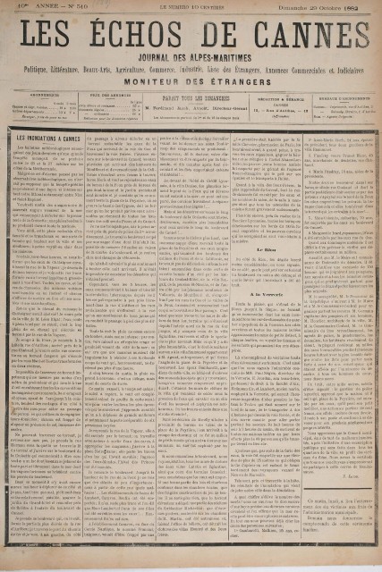 M. Barbe, ancien maire de Cannes, décrit pour sa part, dans une brochure, l’inondation soudaine et dévastatrice du 27 octobre 1882. Il souligne que, contrairement à la crue similaire de 1825, les dégâts ont été bien plus graves à cause des transformations survenues dans la vallée du Cannet : urbanisation, construction de la voie ferrée et disparition des espaces naturels qui permettaient autrefois aux eaux de s’écouler librement vers la mer.