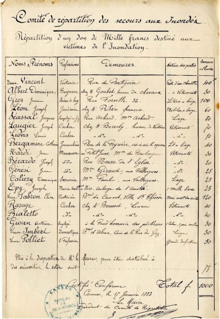 Répartition d’un don de mille francs destiné aux victimes de l’inondation du 27 octobre 1882
