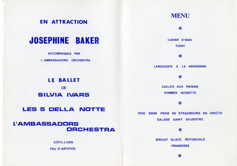 Menu du réveillon avec Joséphine Baker, Soirée de gala aux Ambassadeurs, 31 décembre 1969